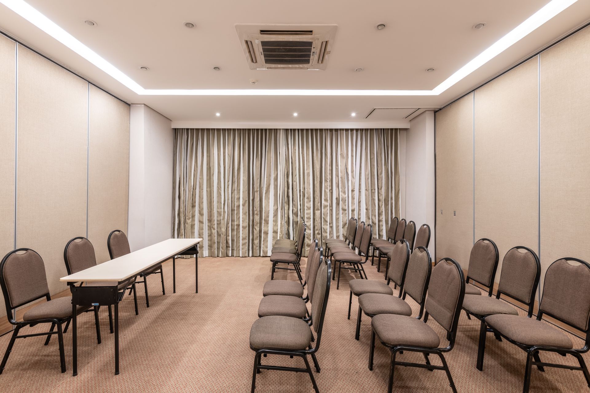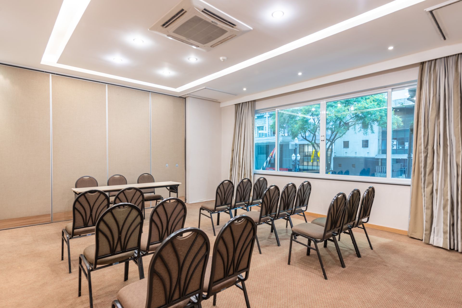 Com 162,09 m², a Sala Única é o principal espaço para eventos do hotel, ideal para convenções, palestras, treinamentos, workshops e eventos sociais. O ambiente amplo permite diferentes formatos de montagem e conta com pé-direito de 2,90 m, proporcionando conforto e boa circulação. Totalmente equipada com Wi-Fi, projetor e equipamentos audiovisuais terceirizados, além de climatização, oferece a estrutura necessária para eventos de médio porte com eficiência e qualidade.
