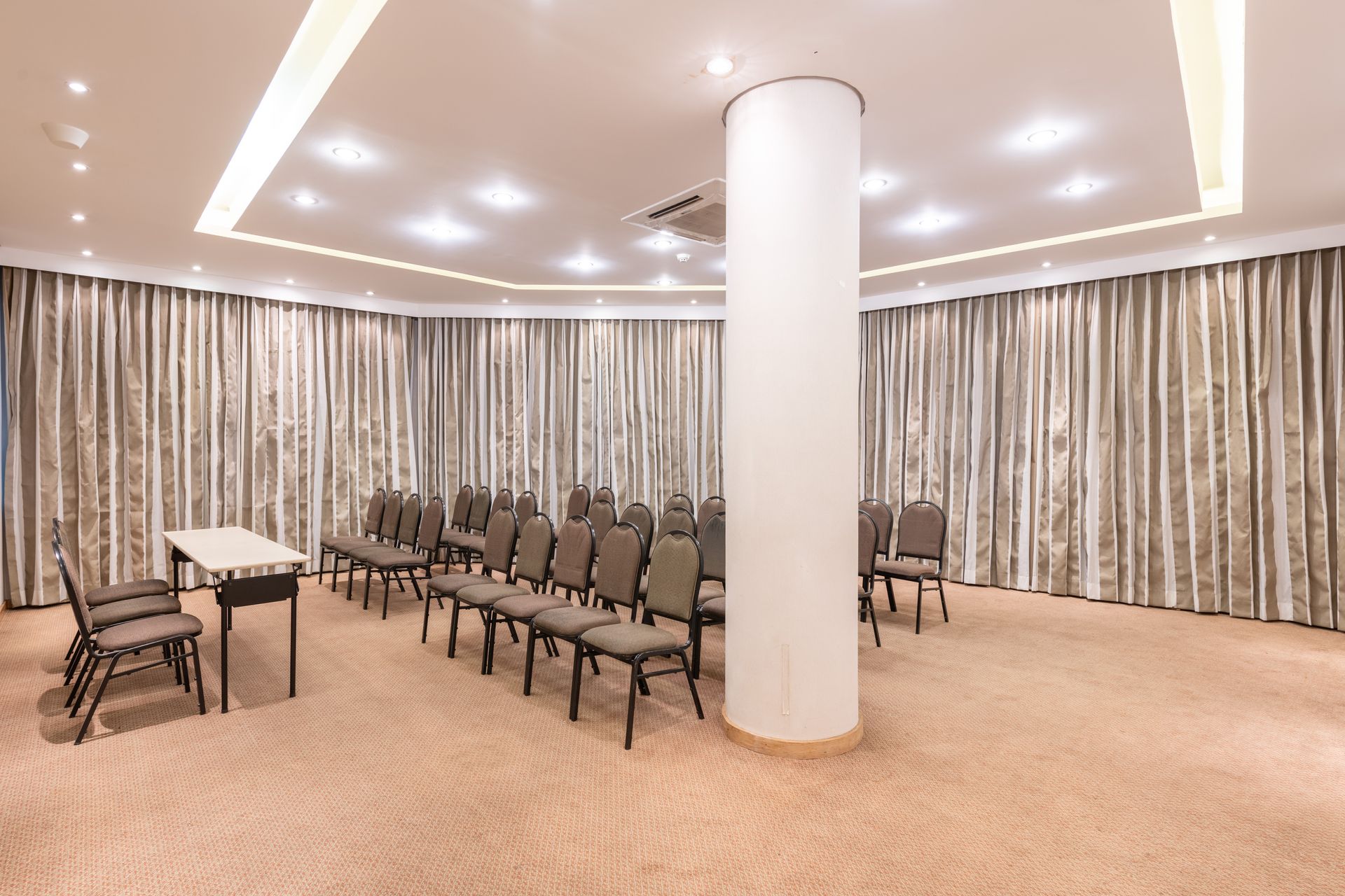 A Sala 2 possui 28,13 m², sendo ideal para reuniões menores, entrevistas, comitês ou encontros executivos. O espaço oferece praticidade e privacidade, contando com Wi-Fi, projetor e equipamentos audiovisuais terceirizados, além de climatização, garantindo eficiência para eventos de menor porte.